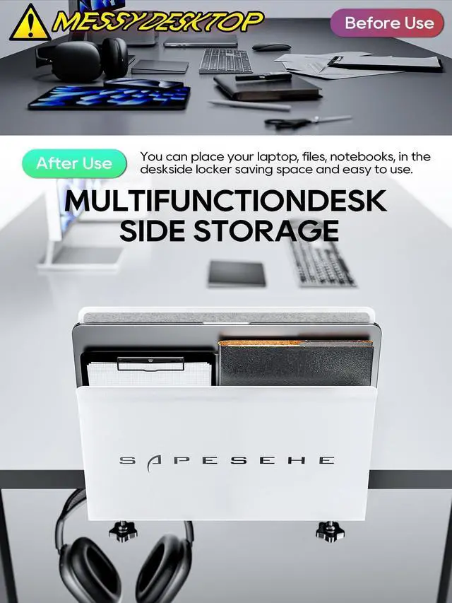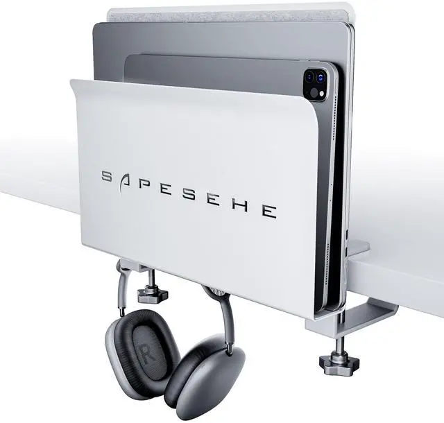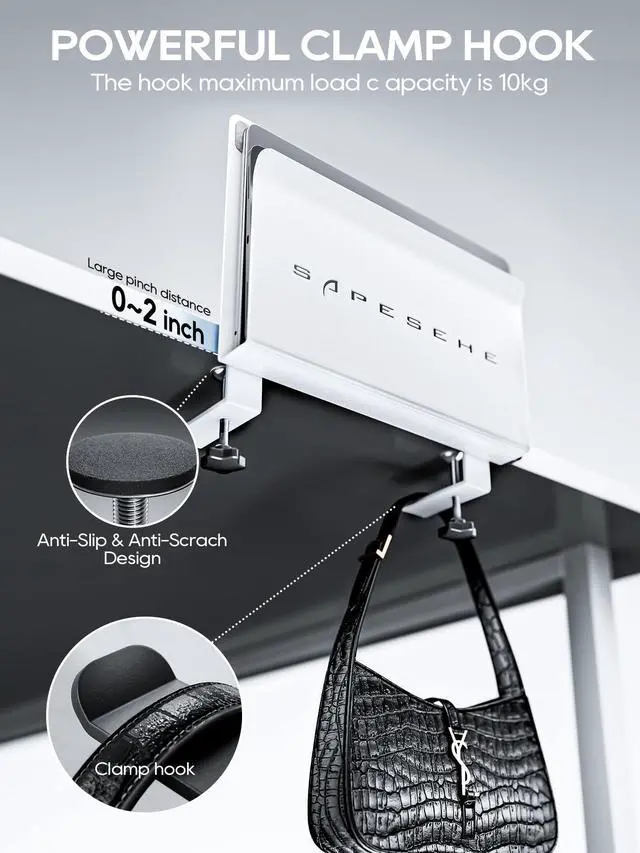 The actual product looks very textured and classy, and is very suitable for installation in the office desk, saving space while making the desk more beautiful. ^^ Compatible with Full-size Laptops----The laptop holder width is 1.45 inch and the load capacity is 22lb, which can load any sizes of laptops/Tablets. Also hold keyboards, notebooks, magazines, etc. ^^ Safe Heat Dissipation Design----The desk side storage is designed with some heat dissipation holes. When charging an idle laptop, please place it on the laptop holder with confidence. ^^ 3.2 -inch Extended Hook----The desk clip has a 3.2 -inch extended hook that can be used to hang headphones, bags, hats and other items.
