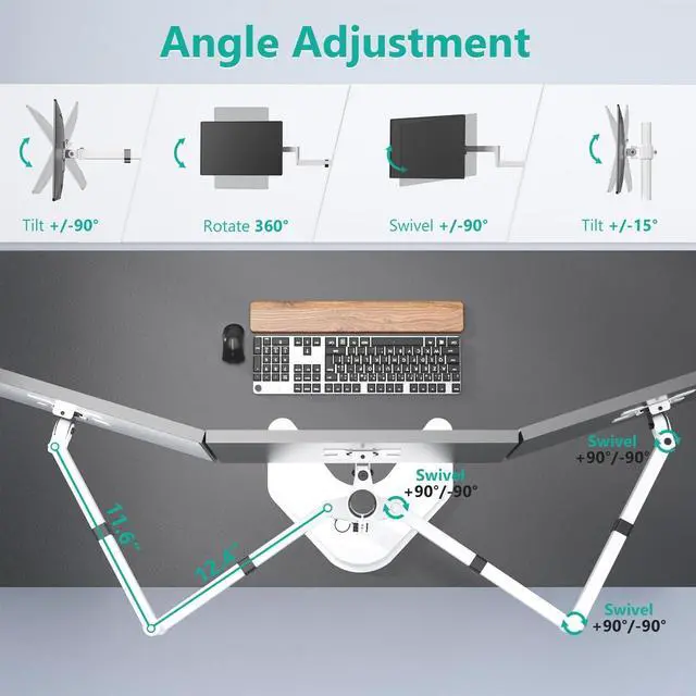 ^^ Adjustable: Arms extend and retract with full height adjustable on 16 height pole, center monitor +/-15 tilt, side monitor +/-90 tilt and swivel to change reading angles and 360 rotate from landscape to portrait mode.