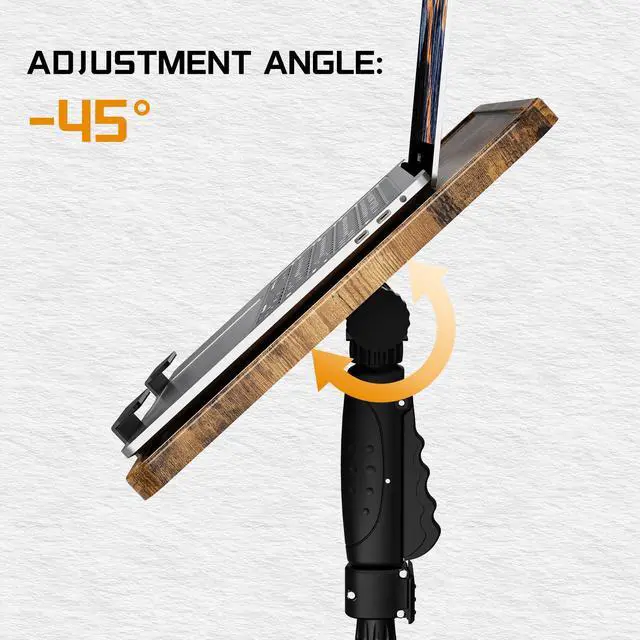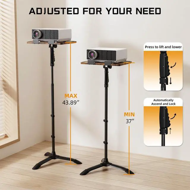 One-Hand Height Adjustment This Laptop Floor Stand features a safety lock for instant height fixation and a 45 tiltable desktop. Easily push up or pull down with one hand for smooth stepless adjustment from 37.0" to 43.9". This adjustable stand tripod offers continuous customization beyond preset intervals, ensuring perfect ergonomic positioning for any scenario with secure locking at any height. ^^ Sturdy Tripod Base Our Projector Floor Stand features an enlarged triangular base for superior stability. The wide tripod design prevents tipping while supporting 33 LBS. Your equipment stays secure during presentations and performances.