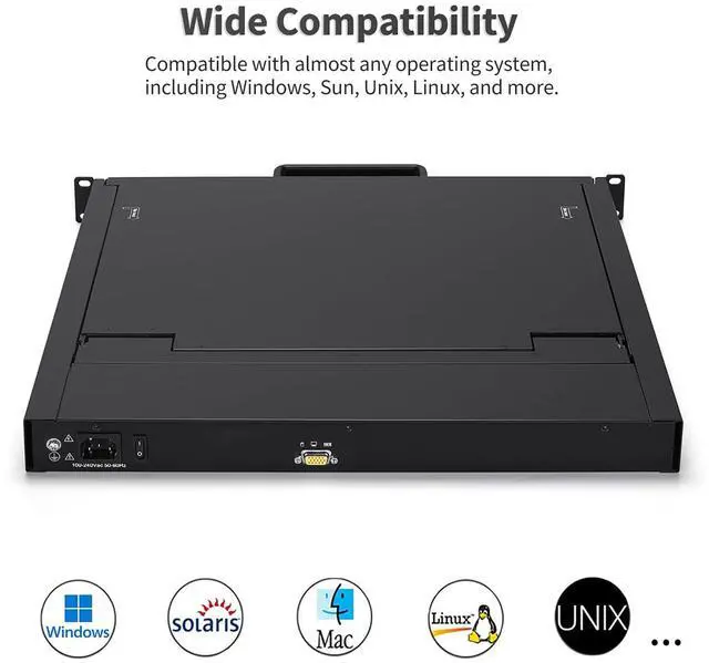 Mount KVM Console: The VGA LCD KVM console features a 19" LCD monitor, full 99-key keyboard, and touchpad, all within a compact 1U housing. It can control one computer from a monitor, keyboard and mouse. Compatible with various operating systems, including Windows, Sun, Unix, and Linux, this KVM console is a versatile solution for diverse IT environments.