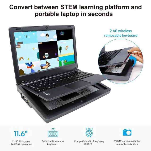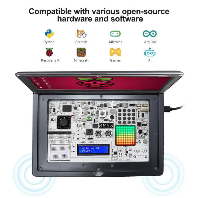 All-in-one Board: The raspberry pi electronic kit with 22 kinds of sensors and modules are all under one kit, you don't have to wait and wire things, and you can start doing projects instantly and easily with crowpi2 ^^ Special Design & Excellent Build Quality: Raspberry Pi Laptop is exceptionally well planned, designed, and manufactured. The wireless keyboard detaches from the body or stays connected via a magnet. Crowpi2 can be used as a small personal computer, which can be put into a laptop bag and taken anywhere that you want to go ^^