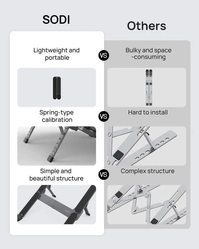 Innovative & Ultra Compact The SODI Bi-foldable laptop stand weighs only 185g (iPhone 16 Pro weighs 199g) and folds up to 12.7 * 4.4 *2cm, making it ultra light and easy to carry in your backpack or pocket for effortless mobility. Perfect for business trip, daily travel, library, cafes work, etc. ^^ Innovative & Spring-loaded Unlike conventional PC stands, the adjustable arm adopts spring design can align screens to eye level for ergonomic comfort in 1 second. It can also be adjusted in 6 different heights to meet different angle needs for desk.