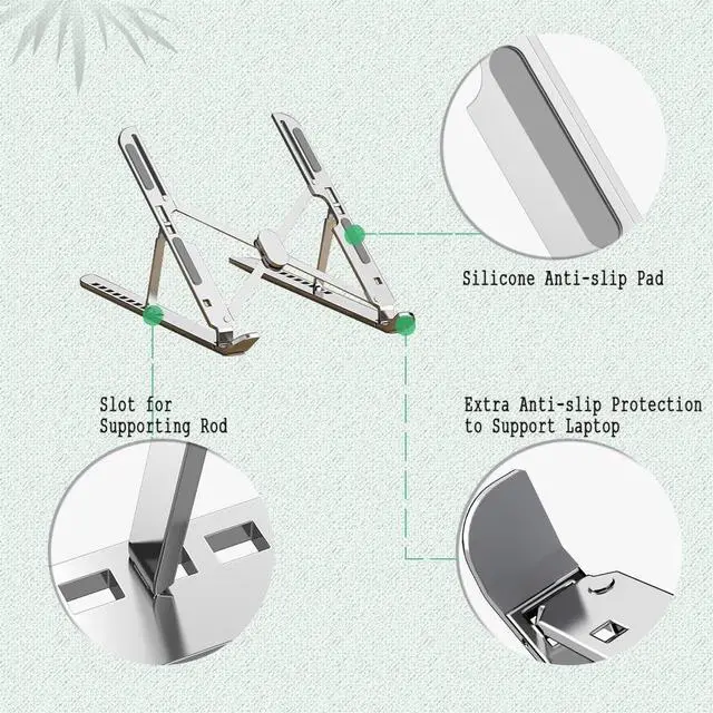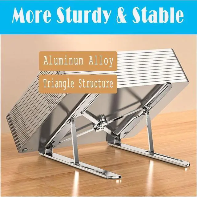 • Sturdy and Stable: The bracket has a strong load-bearing capacity and no squeaks, thanks to the aluminum alloy material, two supporting rods and triangle mechanical design. The silicone anti-slip strips further ensure laptop's stability