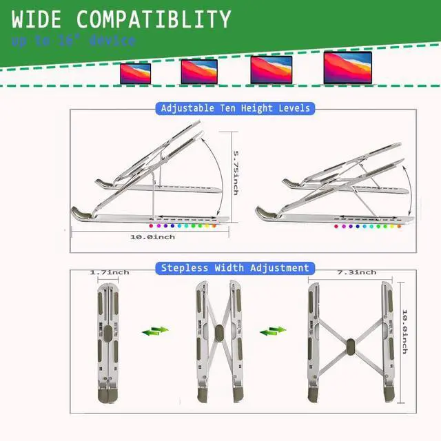 • Compatiblity: The aluminum laptop stand can suit a variety of multi-size laptops, including Macbook Air/Pro, HP, Surface, Tablet PC, Dell, Acer, up to 17 inches