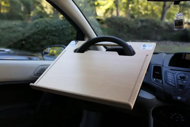 The Executive steering wheel desk measures 17 3/4 13 7/8 provides a stable surface for most laptops, tablets, phones, and paperwork. Park your vehicle, slide the desk over your steering wheel, and you have an instant mobile workspace. Designed for professionals who spend significant time in their vehicleswaiting for appointments, meeting clients, or managing carpoolsit offers a practical alternative to balancing items on your lap. Compatible with cars, SUVs, and trucks, the WheelDesk stores easily in most seat-back pockets or beside the center console when not in use.