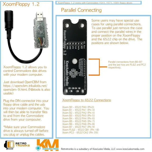 XoomFloppy 1.2 is an easy to use thumb drive sized XUM1541 device that allows transfers between your modern comuter and old Commodore floppy drives. It works with the 1541, 1571 and 1581 Commodore drives. You can use OpenCBM to communicate between the drive and your computer but it is also compatible with Nibtools. For the 1541 drive you must connect via the parallel connections to use Nibtools, however, with the 1571 drive Nibtools will work via USB. XoomFloppy 1.2 is easy to use and a great way to save your old Commodore disks or download new software to run on your old system.