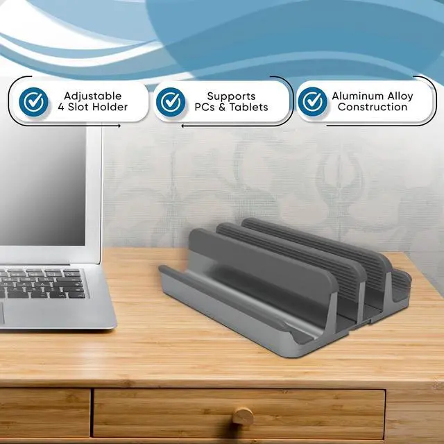 Elestoria 4 - Slot Vertical Laptop Stand - Aluminum Laptop Stand Vertical for Desk - Fits MacBook Pro/Air, Surface, Mobiles & Gaming Laptops up to 17.3" - Heavy Duty Laptop Holder for Desk - Grey