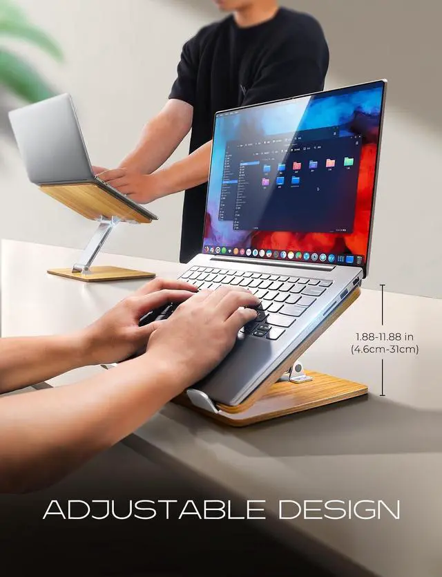 Ergonomic Height & Angle AdjustmentThe Niweya laptop stand elevates your laptop screen from 1.88" to 11.88" ( 4.6 cm-31cm), providing a customizable ergonomic viewing angle. This design helps reduce neck and back strain, ensuring better posture for long hours of work or study. ^^ Exquisite Craftsmanship, Unique Wood GrainFeaturing a sophisticated walnut wood grain finish, this wooden laptop stand for desk combines durability with elegance. Unlike cold metal, the wooden design adds a calming element to your workspace, reducing stress and enhancing productivity. At the same time, the wood texture effectively resists fingerprints and scratches, providing a warm, comfortable surface all year round.