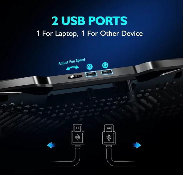 AIMIUZI laptop cooler is specially designed to cool down up to 15.6 inch laptops. Honeycomb style metal mesh, 1 small fan 4 big fans, flip-up anti-slip pad, 5 adjustable stand height settings, 2 USB ports, adjustable speeds, and USB powered. ^^ The laptop cooling stand is set with a small central fan with two big fans on each side (5 total low noise fans), providing more airflow to keep laptop cool down. At the back of the laptop fan cooling pad, there is a switch wheel that turns fans on and off.