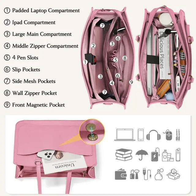 LARGE CAPACITY & MULTI-POCKETS: This work tote bags for women offers spacious storage capacity. 1 foam padded laptop compartment for 15.6" laptop, 2 large open compartments and 1 middle zipper pocket for files and books, 1 wall zippered pocket for personal belongings, multi-functional pockets with keychain for keys, pens, wallet etc, 2 inner side pockets for water bottle and umbrella. Front magnetic pocket for items easy to access and back zipper pocket for phone or passport ^^