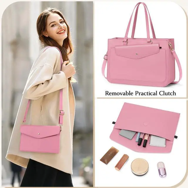 WORK TOTE BAG: This leather womens laptop bag comes with an additional clutch bag( 11.4" L x 6.7" H), perfect for storing small accessories, cables, cards, glasses and makeup, complementing the computer bag for coordination of fashion and functionality. The adjustable shoulder strap is 22.4" - 44.8" long, which can suit women of all heights and comfortable for wearing, making this bag easily transform into a briefcase for women, work shoulder bag, or laptop crossbody bag ^^