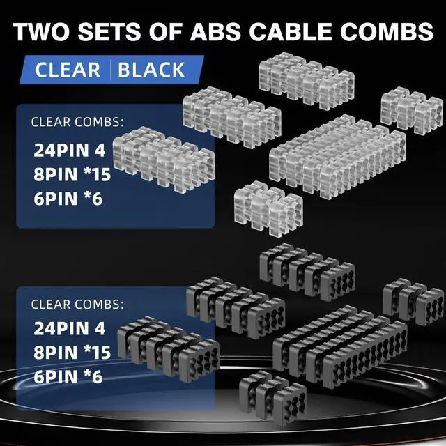 The kit includes: 1x24 PIN ATX Extension Cable (For Motherboard), 2x4+4 PIN EPS Cable (For CPU), 3x 8to 6+2 PIN PCI-E Cable (For GPU) ^^ 16AWG CABLESOur PSU extension cable uses 16AWG copper wire, which significantly increases the copper content, reduces resistance and power consumption, and solves the problem of power line heating caused by the use of high-power products ^^ CABLE COMBSThe set of white connector housing provides 4 pure white cable combs for each cable. The set of black connector housing provides 8 cable combs (4 clear+4 black) for each cable ^^ MULTIPLE COLORSSMEOZZ offers a variety of colors for you to choose from, allowing you to freely DIY your computer case and make it stand out from the crowd ^^ SALES SERVICEIf you have any questions or problems in your shopping, please contact us. Our team will provide you with the good service