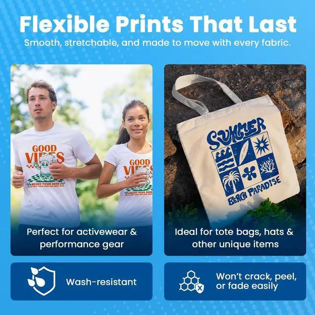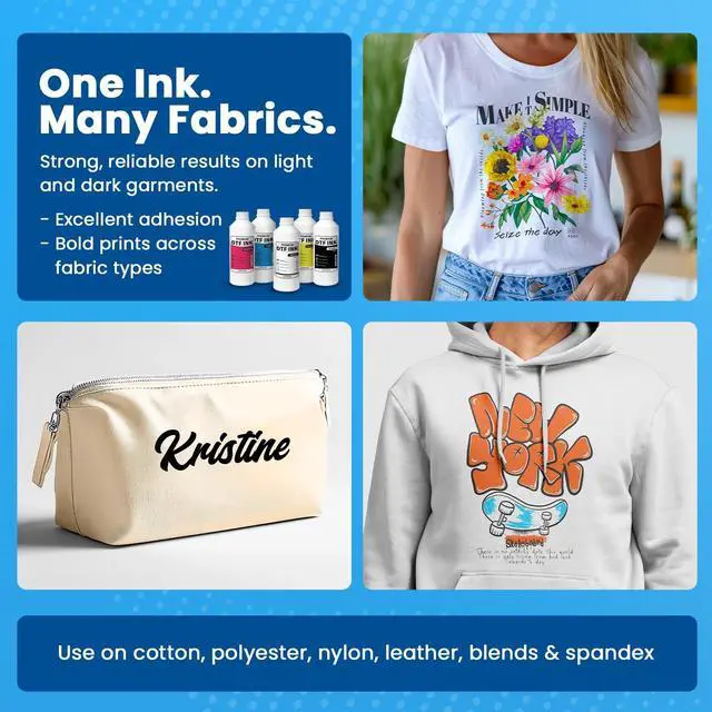 WORKS ON ALL FABRIC TYPES: Bonds cleanly to cotton, polyester, spandex, nylon, canvas, leather, and denim. Creates soft-hand, flexible prints that resist cracking, peeling, and fading even after repeated washing. Perfect for shirts, jeans, babywear, tote bags, and high-quality DTF garment production requiring durability and comfort. ^^ CLOG-FREE FORMULA FOR SMOOTH INK FLOW: Engineered for stable, nozzle-friendly performance, this advanced DTF ink maintains continuous, clog-free ink flow with consistent opacity throughout long print runs. Ideal for high-speed DTF printing, bulk transfers, and daily production workflows that demand clean output, minimal maintenance, and reliable operation. Performs smoothly in both DTF and DTG-converted printer systems. ^^ DTF INK FOR HEAT PRESS & PET FILM TRANSFERS: Water-based, odorless, and non-toxic white DTF ink designed for direct-to-film printing on all fabric types. Optimized for PET film heat transfer workflows, it delivers vivid, wash-resistant prints with accurate color consistency and smooth laydown. ^^