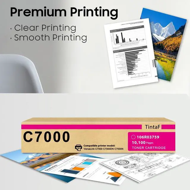 High Page Yield: TintaF C7000 cartridge toner up to 10, 100 pages per magenta high yield, Letter/A4 at 5% coverage ^^ TintaF for 106R03759 toner cartridge upgrade material with high printing quality, clear text, high page yield ^^ TintaF C7000 toner cartridge with 1x magenta (106R03759) continues to provide you with high print volume, and smooth printing experience