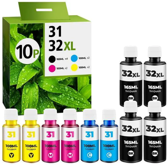 Contents: The package includes a 32xl black ink bottle*4 and 31 ink bottle set*5. The 31 ink bottle set includes 31 ink Cyan*2, 31 ink Yellow*2, and 31 ink Magenta*2. Totally 10 pack smart tank refill inks. And they are high capacity 31 32xl ink bottle set, the 32xl black ink is 165 ML, the ink 31 of Cyan, Magenta and Yellow are all 100 ML. These 31 32xl inks are for smart tank 5101 ink, smart tank 7602 ink, smart tank plus 651 ink, smart tank 5000 ink, smart tank 6001 ink, smart tank 7301 ink ^^ 31 32XL