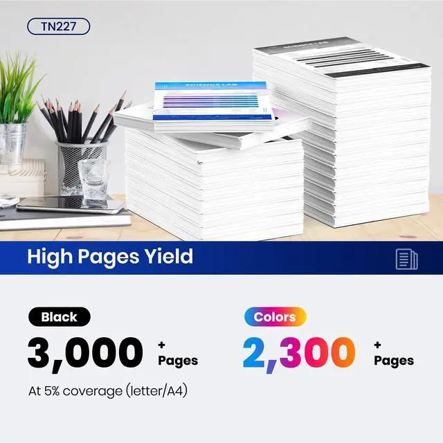 High Page Yield: Up to 3000 Pages per tn227BK tn-227 Black Cartridge, Up to 2300 pages per tn227 C/M/Y Color Toner Cartridge at 5% coverage of A4 paper ^^