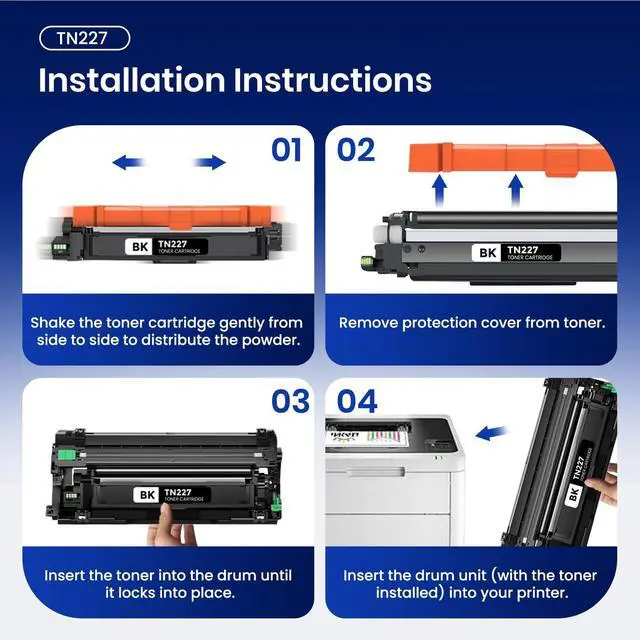 Warm Tips: After you installed the TN-227bk/c/m/y high yield toner cartridge replacement, your printer displays "No Toner" "Cannot Detect" "Cartridge Error" message, please restall the toner cartridges to make sure the chip of the toner cartridge is in good contact with the printer