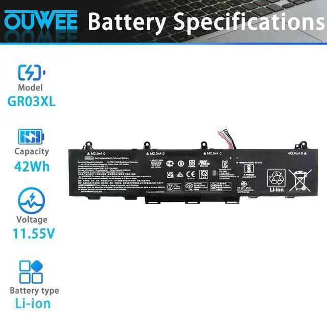 Type: Li-ion; Our GR03XL Battery Replacement for HP 42wh Standard GR03XL Rechargeable li-ion battery.