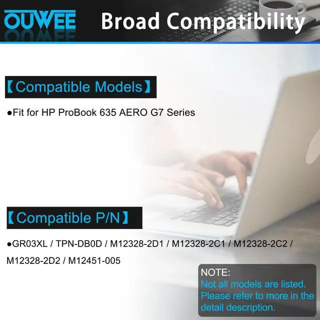 Condition: New; ^^ Fully compatible and high stabilityFit for HP ProBook 635 AERO G7 Series. ^^ Replacement Battery Part NumbersBattery for GR03XL / TPN-DB0D / M12328-2D1 / M12328-2C1 / M12328-2C2 / M12328-2D2 / M12451-005 ^^ OUWEE Perfect After-saleRest assured with 30 days money-back and 12 months Warranty; 24 x 7 email support. Any questions you can contact with us via "Your Orders" tab in account. We are committed to resolving any situation in which our product does not meet your expectations. ^^ Safe to UseAll OUWEE products are Certified by UL / CE / FCC / RoHS for safety. Strict guidelines for compatibility, strict quality control standards to ensure the true capacity, stable current and low self-discharge and standards compliance for environment safety. We are confident in the performance of the replacement battery. ^^ AdviceIn the event that the new battery fails to be recognized upon initial installation, kindly reinstall it and verify whether the interface is fully connected. Next, discharge the new battery to 5% (do not discharge it to 0%). Subsequently, charge the battery and perform 3 - 4 charge - discharge cycles to "wake up" the new battery.