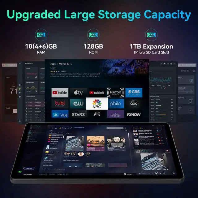 ^^ 10GB RAM+128GB ROM+1TB ExpandThe Android 14 Tablet is equipped with 10(4+6)GB RAM+128GB ROM large capacity, And supports 1TB of expanded storage space (Micro SD/TF card is not included). The enough memory allows you to store more e-books, music, pictures, videos and games. Say goodbye to the worry of memory shortage. ^^ 6800mAh Battery Large-CapacityThe Android tablet with 6800mAh large-capacity battery, with long standby time that provides longer reading and browsing time. allowing you to carry it anywhere and anytime. And the USB-C port supports audio and data transfer.