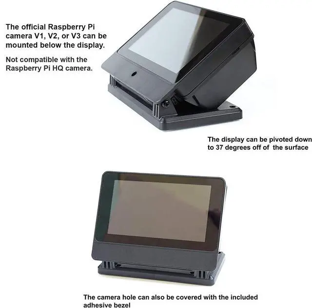 Micro SD card access on the side of the case ^^ Works with the Official 7" Raspberry Pi display and Raspberry Pi 4 and 5 ^^ Includes a cooling fan with rubber vibration mounts ^^ Raspberry Pi, Raspberry Pi camera, and Raspberry Pi display not included ^^ Weighted base ^^ Works with Raspberry Pi HAT boards and has secondary mounting points for your own development board ^^ Not compatible with Raspberry Pi Touch Display 2