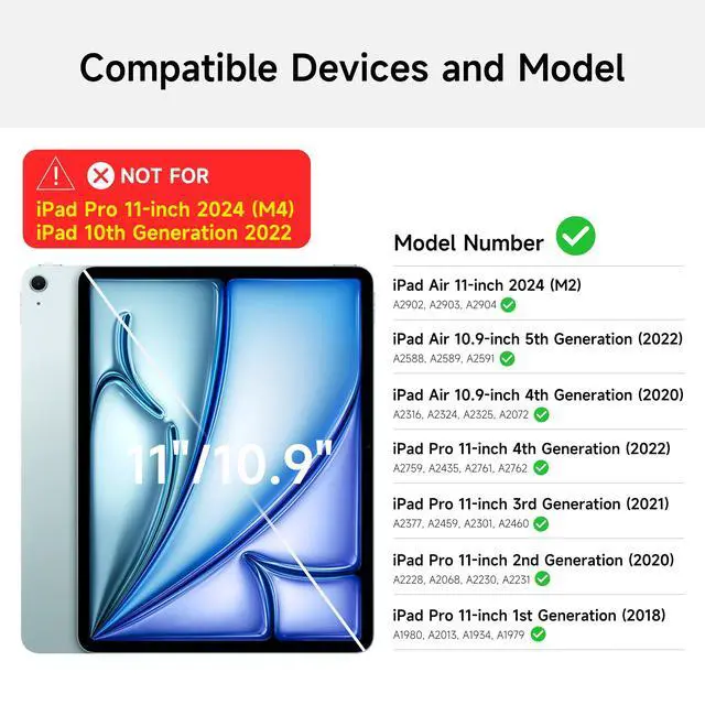 CompatibilityThe keyboard is compatible with iPad Air 11 inch M3/M2 2025/2024(A2902, A2903, A2904), iPad Air 5th/4th Generation(A2588, A2591, A2589, A2316, A2324, A2325, A2072) and iPad Pro 11 inch 4th, 3rd, 2nd, 1st Generation 2022-2018 (A2759, A2435, A2761, A2762, A2377, A2459, A2301, A2460, A2228, A2068, A2230, A2231, A1980, A2013, A1934, A1979). Please Check the bottom of your ipads back, ensure your ipad's model number Axxxx before purchasing.