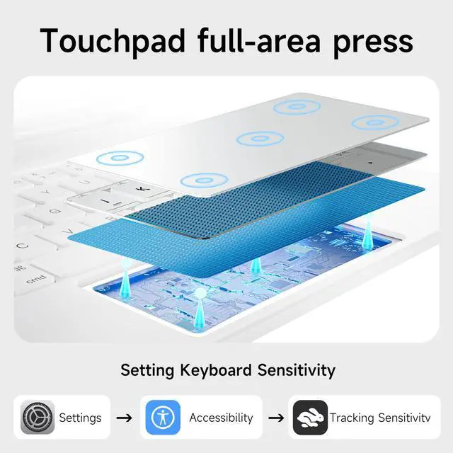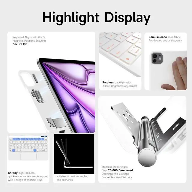 ^^ Magnetic Attach: Innovative magnetic attachment design guarantees a secure connection between the keyboard and device, while remaining effortlessly detachable, facilitating seamless transitions or portability.