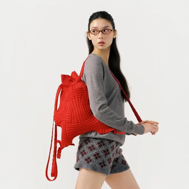 DESIGN: Navy backpack featuring unique pleated texture pattern and drawstring closure for a distinctive contemporary style ^^