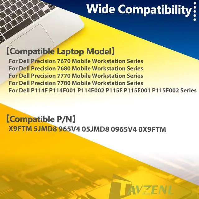 Battery Color: Black 100% brand New from Manufacturer. ^^ Compatible Modelfor Dell Precision 7680 7770 7780 7670 Series. ^^ Compatible C/NX9FTM0X26RT05JMD80X9FTMRCVVT0NWDC0965V40965V45JMD8 ^^ HIGH-PERFORMANCE, LONGER LASTINGWe have passed a series tests of short circuit, overheating, and overload protection before shipments. ALL of our battery are CE, FCC, RoHS Certified. Premium battery chip, makes a faster-charging and longer-lasting performance to meeds your daily working, learning and playing needs. ^^ Reassured After-sales We promise 30-Day Refund & 1-Year Warranty. For any battery questions, just feel free to contact us for help via the order or click on"TAVZENL", then you can see "Ask a question" on the page. We will glad to help you solve any battery problems within 24 hours.