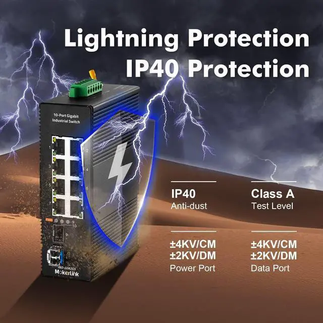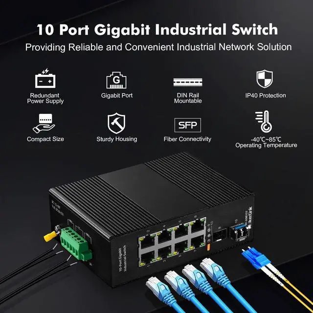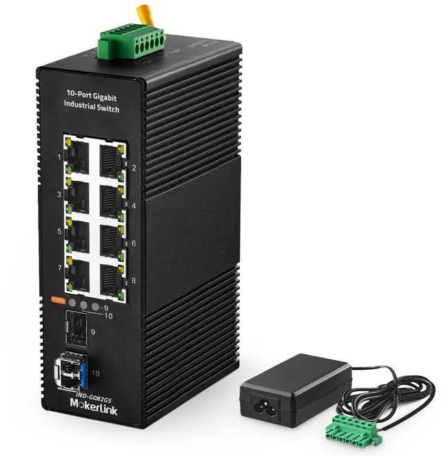 This network switch include 8 gigabit ethernet ports, 2 gigabit SFP slot, with 1 1310nm 20km LC single module, supports long-distance transmission via optical fiber, switching capacity up to 20bps ^^ Support auto-negotiation, plug and play, no configuration needed, low-power consumption CPU, no fan quiet operation, green energy saving, suitable for various networks, such as home office, computer room, warehouse, factory, compact control box and other industrial scenarios with Ethernet access ^^ The shell is made of industrial-grade aluminum alloy, which is more sturdy, surface groove design, better heat dissipation, integrated DIN-rail mount kit, installation and disassembly are very simple ^^ IP40 protection grade, working temperature -40~75C(-40~185F), super robustness, anti-lightning, anti-static and anti-overload protection, adapt to various harsh environments ^^ Dual power supply, automatic fault switching, anti-reverse connection does not damage the equipment, higher reliability, equipped with one UL-certified power adapter, can be used without additional purchase