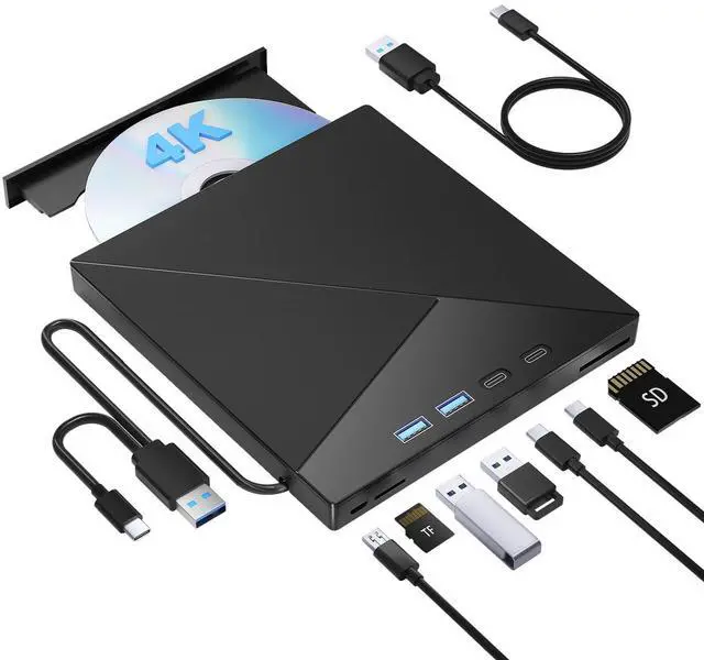 Portable Blu Ray Player: The unique design of our Bluray drive combines both the drive and two different USB cables in one, making it highly convenient and practical. Moreover, the drive features two concealed wire grooves that are specifically designed to store and carry both USB 3.0 and Type-C interfaces. This feature helps users to easily store and transport the Bluray drive without taking up too much space or risk losing one or both cables. The design is both stylish and functional, easy connectivity and setup. With its innovative design and practical features, our Bluray drive is an great choice for users seeking a reliable and versatile external optical drive. ^^ Multifunction Blu Ray DriveThis 7 in 1 external 4K Bluray drive offers versatile features, plug and play. It can read and write BD/DVD/CD discs and has 1 SD card slot, 1 TF card slot, 2 Type-C ports, 1 USB 2.0 port, and 1 USB 3.0 port for data transfer or charging purposes. You can easily transfer music, 4k blu ray uhd movies, and data files from SD cards, TF cards, or through the USB/Type-C ports to your computer.