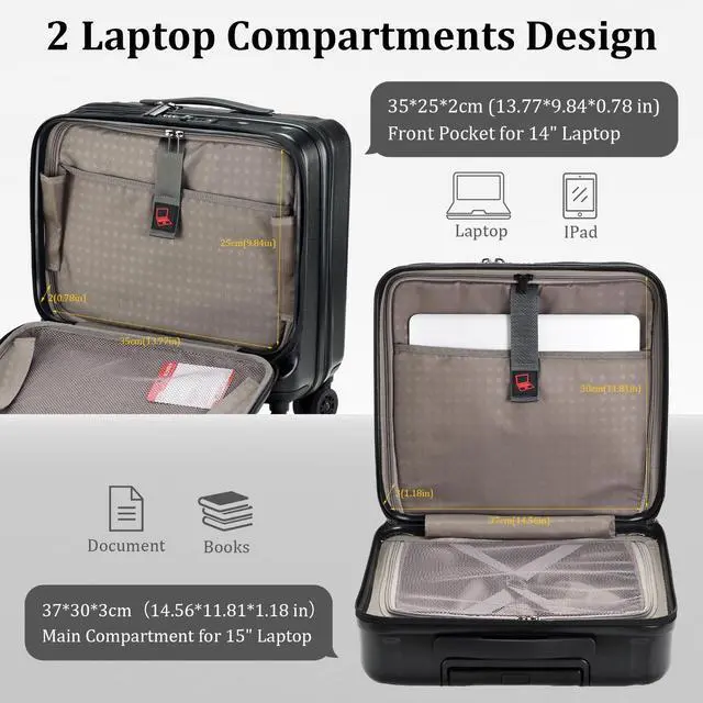 Compartments & Layered Design: Its divide front pocket designed to fit 14" tablet and main for 15" Laptop, you can easily access your electronics while on the go with two zippers for pens, sticky pads, chargers, etc.. Plus you could put a change of clothes, gloves, umbrella etc. in the third compartment. The third place with stretch strap to secure your clothes in place. So if you want a compact carry on for 2 laptops and 1-2 days daily necessities for your business trip, then this is the one! ^^ Dual Lock & with