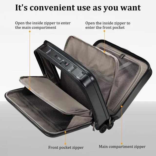 YKK Zipper: The most feature is the dual lock security feature, you can unlock only the side you need or both sides at once. You can choose your own passcode and then to get the locks to pop off, just turn the dial left and/or right. The dual lock with TSA You are at ease knowing that the documents and electronic devices are secure at all times. With YKK zipper is smooth and long last, It ensures smooth and reliable closure, preventing the risk of zipper jams or breakage. ^^ Telescoping Handle & 360Silent