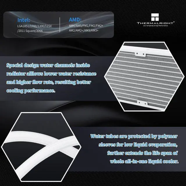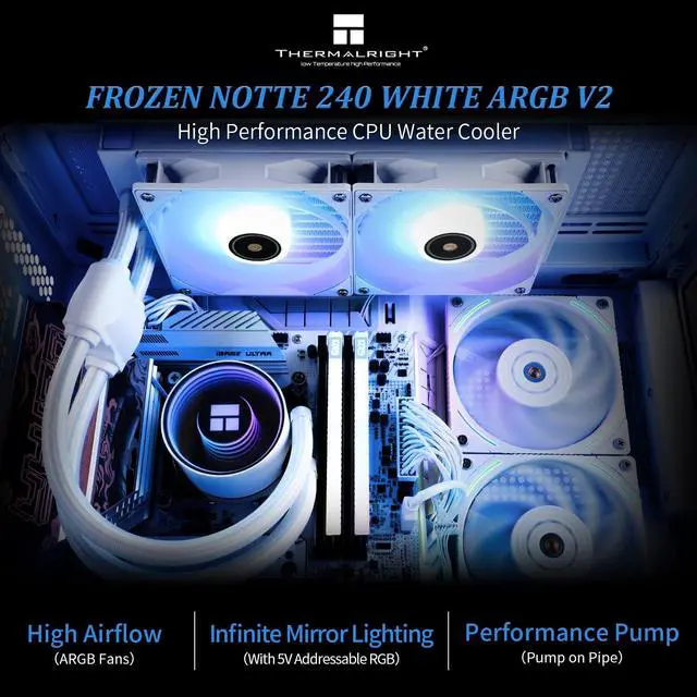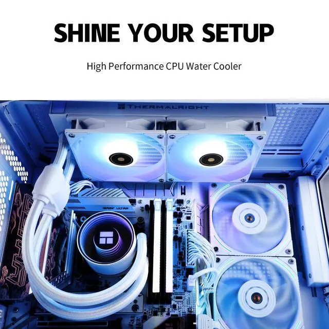 Better coolingWater block with full copper mirror plane base + 240 specification white aluminum fin cold plate + high polymer woven protective water pipe + standard 120mm ARGB fan to create low resistance, high cooling, low Evaporative, long-life integrated water-cooled cooler. ^^ ARGB God Light Synchronization The ARGB of the pwm fan and the water-cooling head is synchronized with the 5V 3pin on the motherboard, 1600W color soft light effect, efficient cooling while providing rich lighting effects (creating a dazzling light world), supporting lighting effects Connect in series to avoid insufficient light slots.
