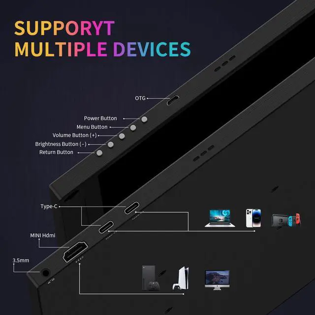 ^^ Dual USB-C Port: This extend monitor provides 2 Full Feature USB-C ports and and a HDMI port. You can connect our computer display to your devices with only one USB-C Cable (Need devices with full-featured USB-C port) or HDMI cable and power supply. Perfect for most laptops, Mac, PCs, PS5/4, XBOX, or Nintendo Switch, and more.