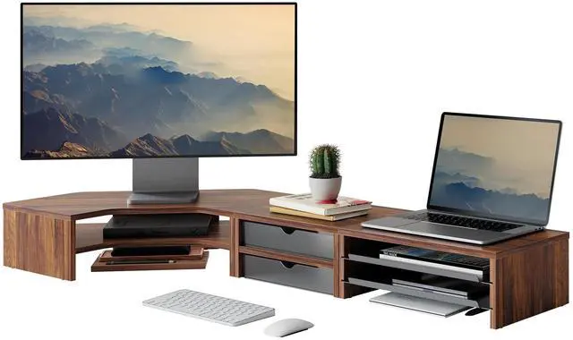 Empower Your Productivity & Creativity: Fenge 43.8 inch extra large dual monitor stand designed for peak productivity. Its expansive surface easily fits two 27-inch screens side-by-side, and elevating your screens 5.3 inches, Fenge triangle monitor shelf helps align your line of sight with the display center. effectively reducing neck and shoulder strain during long working hours ^^ 15 Minutes to