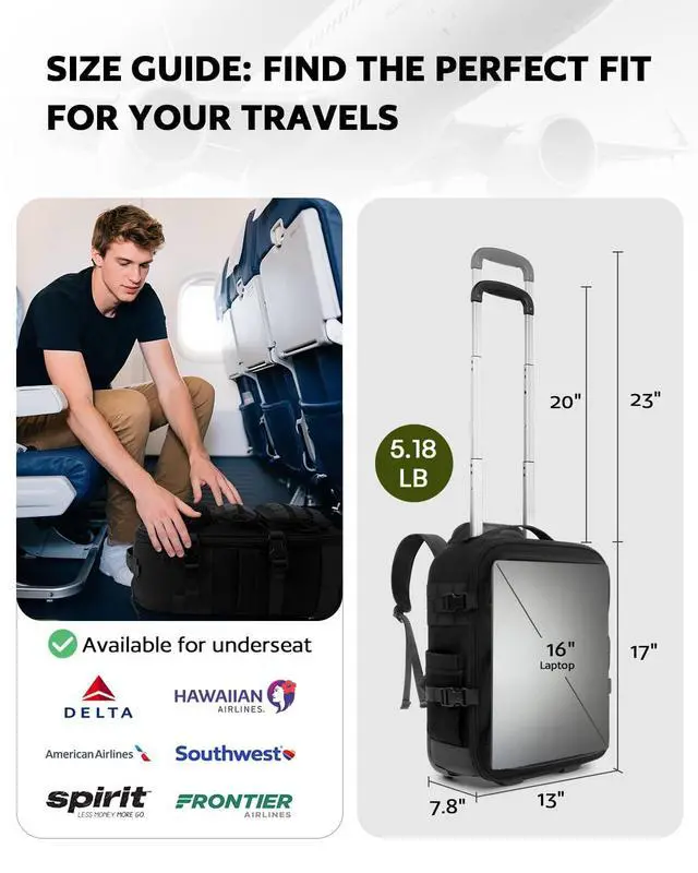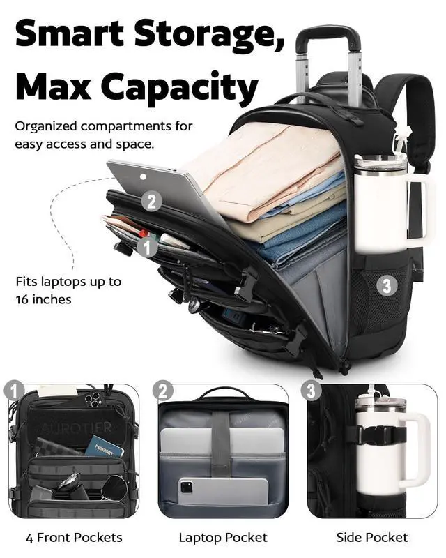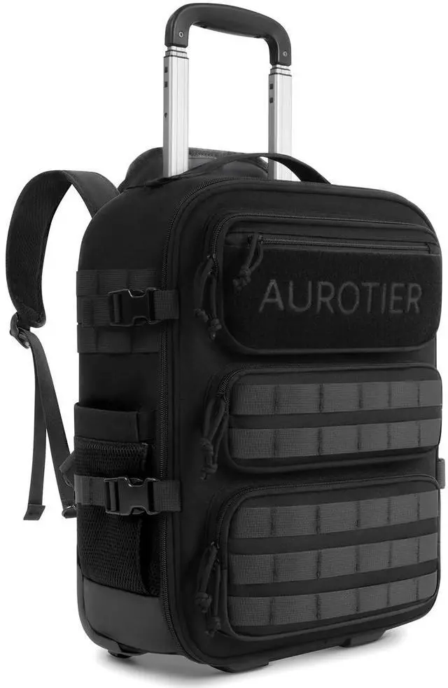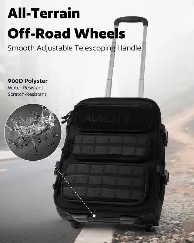 From Books to Gear, It Fits All HereThis rolling tactical backpack features a combined main and laptop compartment to maximize packing spacewhile still meeting most airline underseat or carry-on size requirements. A slim telescoping handle saves interior space, and this molle backpack with wheels includes a built-in modular system that lets you attach extra pouches or gear for expandable storage ^^ Three Ways to Carry Roll it, Grab it, or Wear it! Our rolling laptop backpack features an adjustable dual-pole handle for personalized comfort. The sturdy dual-rod design ensures smooth rolling and strong load supportperfect for daily commutes or travel.