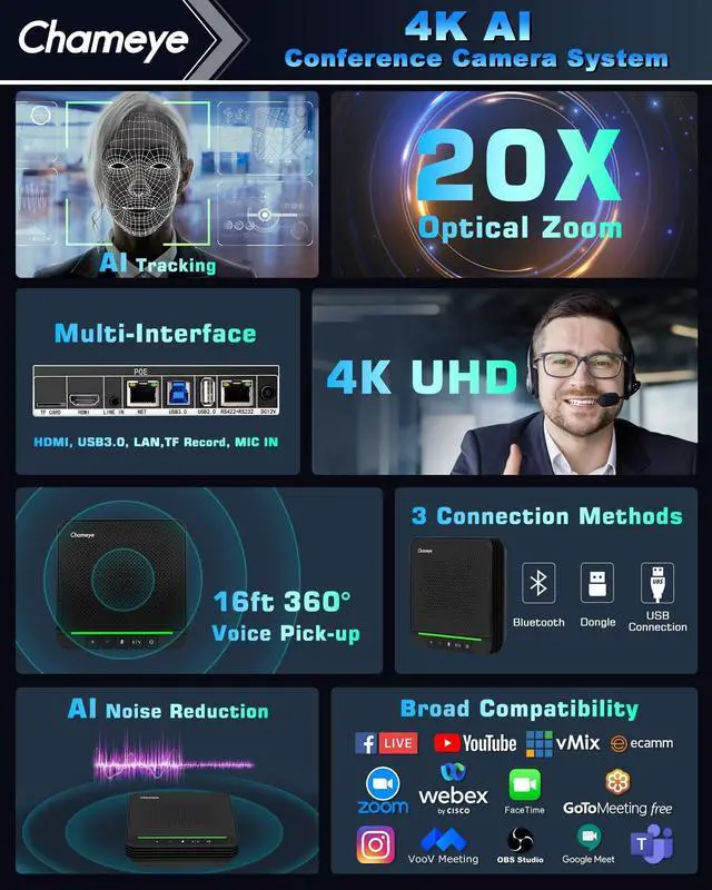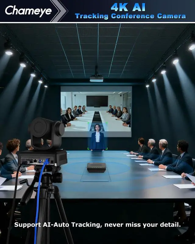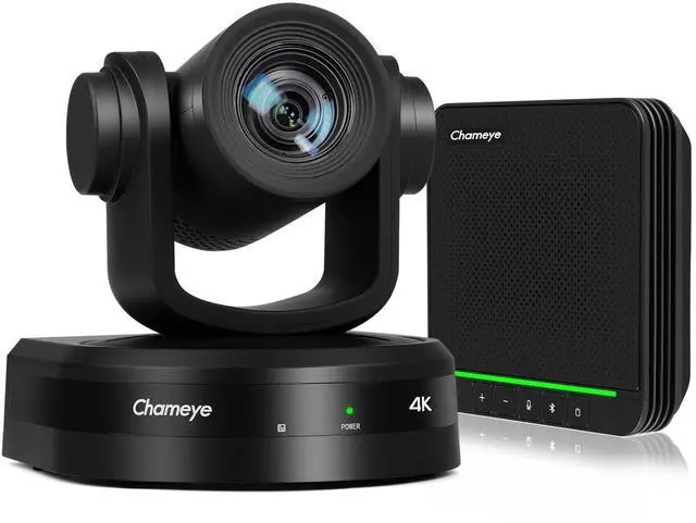 ALL-IN-ONE 4K PTZ Conference Room CameraChameye conference room camera system integrates CH420 4K 20X Zoom with AI-Auto tracking UHD PTZ USB Camera and a high-performance Bluetooth conference speakerphone. Each component works independently, perfectly fitting video conferencing, live streaming, teaching and other scenarios. A cost-effective professional audio-visual solution for medium & large meeting rooms. ^^ 4K UHD & 20X PTZ CameraThe 4k conference camera adopts a 1/ 2.5 -inch high-sensitivity CMOS sensor ( 8.51MP ), delivering 4K (3840x2160) ultra-clear video at 30fps. 20x optical zoom + 16x digital zoom + fast auto-focus easily captures distant details and covers the entire conference room, with automatic exposure & 2D/3D noise reduction ensuring sharp images even in low light (ideal for 60 square meters with 15-20 participants) ^^ AI AUTO-Tracking & AUTO Framing4K PTZ Conference Camera supports sensitive body tracking and automatic framing never miss a moment.