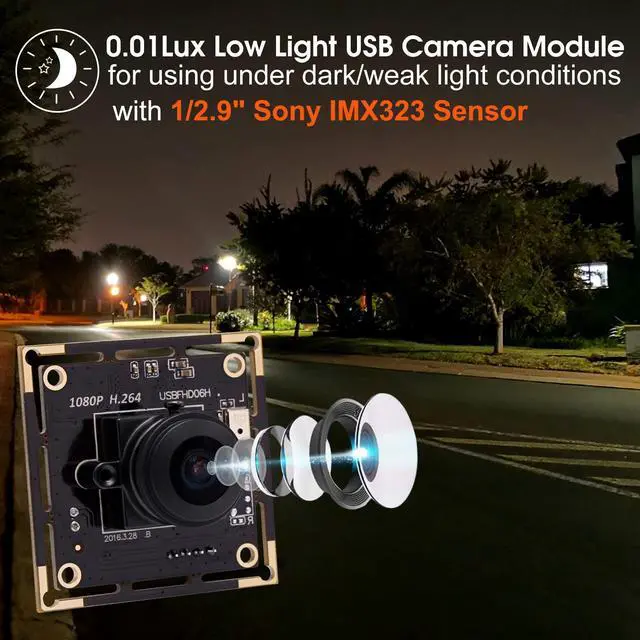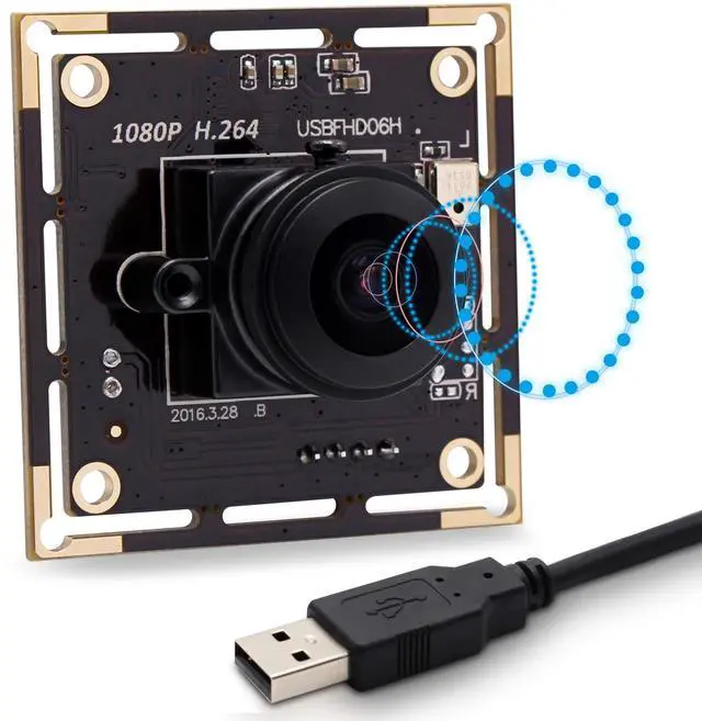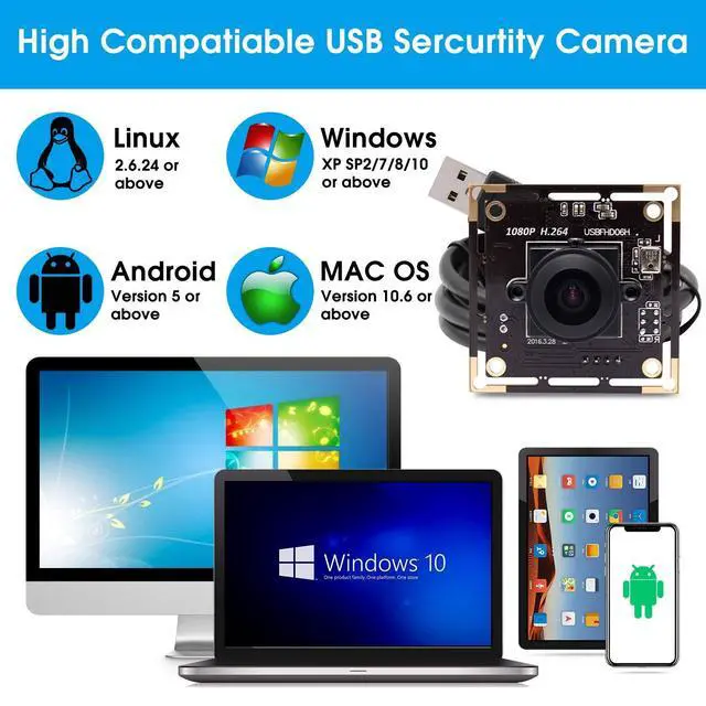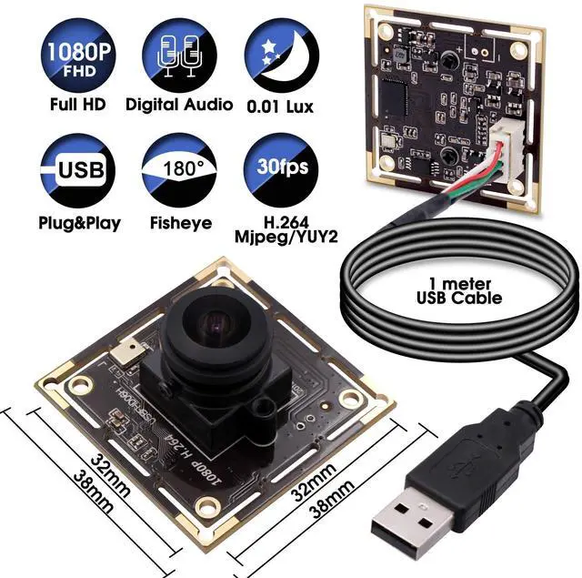 Resolution: 1920x1080 with high frame rate 30fps; 1280x720@ 30fps; 640x480@ 30fps. ^^ H. 264 High Compression with MicrophoneUSB Camera Board with high quality digital microphone equiped for audio. Advanced H. 264 encoding compresses a digital video file so that it only occupies one-twentieth the space of MPEG to deliver the same quality video. Enjoy stunning HD video with impressive video performance and faster transmission speed. ^^ 180Ultra Wide LensUSB camera board module with fisheye lens is designed for shooting very wide angles, they are popular in landscape, extreme sport, and artistic photography, with this wide angle lens it can capture an extremely wide image and incredible viewing, give you a different visual experience. ^^ Low Light Camera 0.01 lux Ultra Low light web security camera module with Min. illumination 0.01 lux, available to work under weak light conditions and catch sharp clear image and accurate color in dark places, a good choice for security camera. ^^ Highly Compatible Driverless 2 Megapixel USB board module with 2.0USB cable is very easy to set up just plug & play, Work with Windows XP/Vista/Win 7/8/10, Linux, Mac and Android systems, also support OTG protocal.