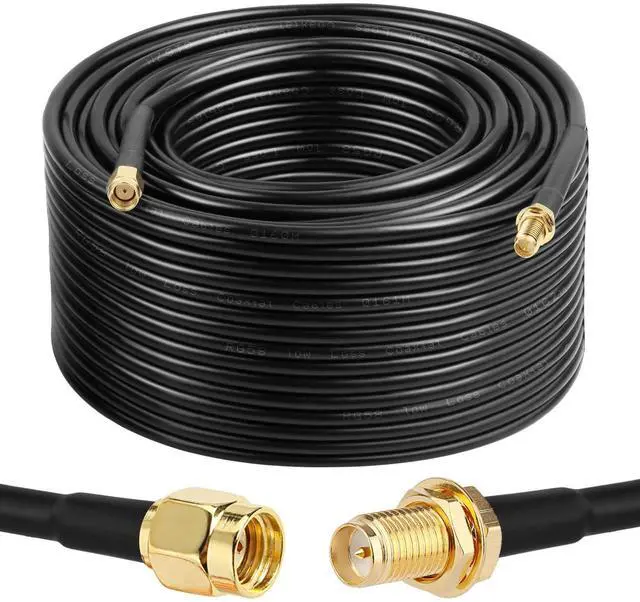 Impedance: 50 Ohm. ^^ [Ultra Low-Loss] - This Low Loss wifi antenna extension cable allows transfer of signals over large distances, supports higher frequency use and minimum signal loss. ^^ [Premium Material] - The inner conductor of this rg58 rp-sma male to rp-sma female coax cable is made of solid copper, so it is efficient and causes low signal loss. The Jacket is made of the flexible and proof-water pvc that could be used so long in the harsh environments in the outdoor. ^^ [Widely Application] - This 50 ohm rp-sma coax cable could be used for Wireless LAN, Wireless Router, Wireless Network Card Adapter, WiFi IP Security Camera, WiFi Antennas, Wireless Video Surveillance Equipment, Wireless Video and so on. ^^ [Package Include] - 1x 150ft RP-SMA Male to RP-SMA Female Cable.