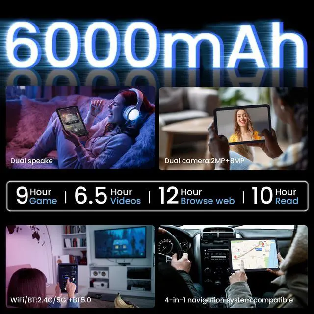 Tablet With GMS certification (Google Mobile Service), pre-installed Google Play, Support social apps such as Facebook, Twitter, YouTube, Tiktok etc. Well for watching video, chatting online, reading ebook and more. ^^ Featuring 20GB RAM (8+12GB expandable), 128GB ROM, powerful CPU, huge storage, 8MP camera on the rear and 2MP camera on the front. Built-in GPS, FM radio, dual speakers, 3.5 mm headphone jack. Ideal for reading, taking photos, videos, music and more. ^^ This Android tablet has a built-in 6000mAh Li-Ion battery that provides up to 8 hours of uninterrupted video playback, so you can use it for long periods of time without any interruptions.