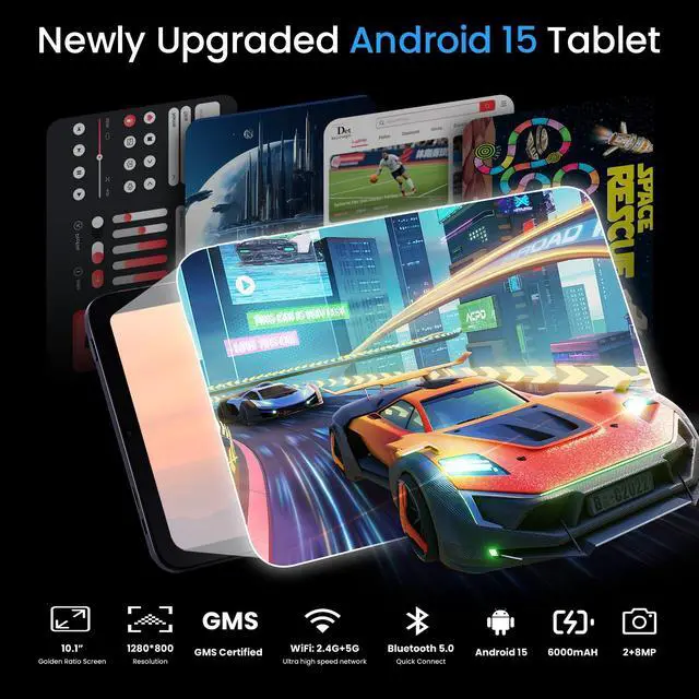 ^^ 10.1 -inch display for vivid visuals. 10.1 -inch 1280x800 display delivers crisp, vivid visuals for an immersive viewing experience. ^^ Stay connected with dual-band 2.4 /5GHz WiFi, Bluetooth 5.0 and built-in GPS. With wireless casting, dual speakers and a 3.5 mm headphone jack, the tablet is versatile and perfect for on-the-go entertainment and productivity.
