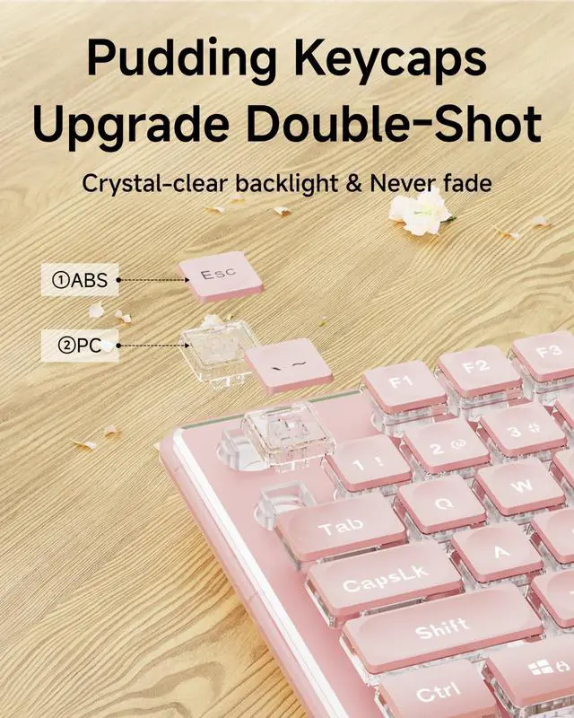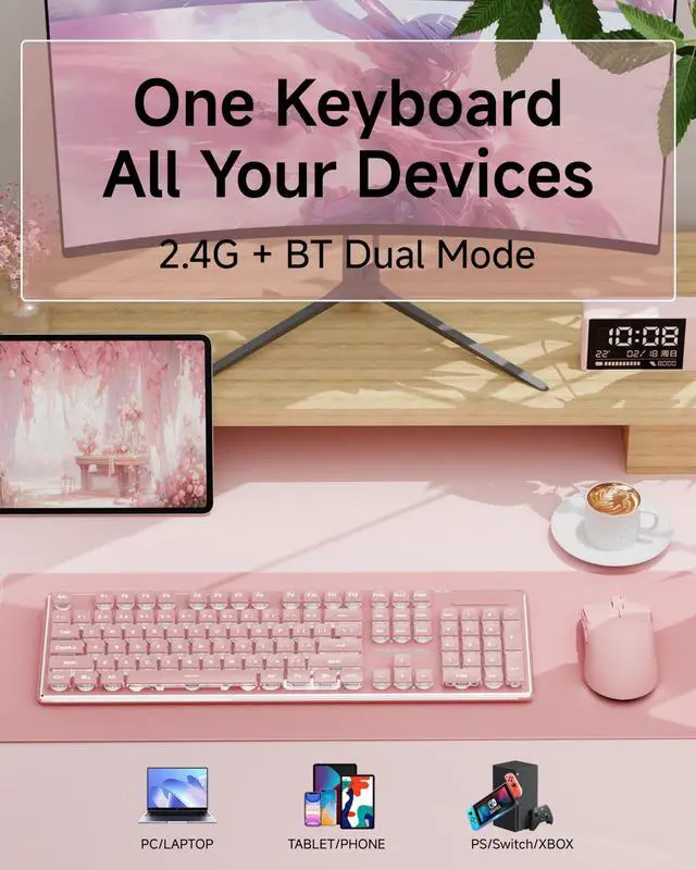 Two Mode & Rechargeable: V3 cute keyboard and mouse wireless provide 2 mode, Bluetooth 5.0 & 2.4GH z, meeting your work, game and study needs. The wireless keyboard mouse combo share a USB receiver to achieve connection of up to 10 meters (33 feet). Press the FN+1/2/3 key combination to enter 2.4G /BT1/BT2 mode. With Type-C cable, you can use it to charge the wireless keyboard pink and you can type or play games uninterrupted while charging. ^^ Thickened Metal Panel & Single Backlight: Bluetooth keyboard and mouse uses thickened metal panel with frosted matte finish, which has upgraded touch and provides great anti-scratch protection, making it more durable. Wireless mouse and keyboard uses upgraded suspended water drop pudding keycap, which is silent and has great light transmittance. When the single warm backlight is turned on, the aesthetic keyboard and mouse will instantly shine. 5 adjustable brightness levels. ^^ Upgraded Water Drop Keycaps & Less Noise: Full size keyboard wireless uses upgraded suspended water drop keycaps with great light transmittance. The surface of the keycaps concave and convex design, which fits your fingertips well, typing or gaming more comfortable and easier. Also quieter, reducing typing noise by 95%. With wireless silent mouse, you no longer worry about noise disturbances in the library, cafe, office or dormitory. ^^ Ergonomic design & 26-key