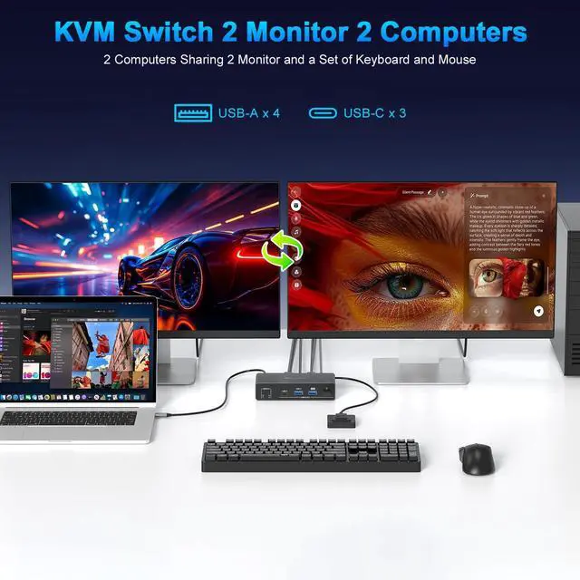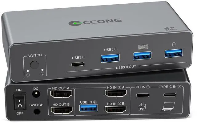 Elevate your multi-monitor workspace with this advanced 2x2 KVM switch that lets you control two computers across dual displays with seamless 4K@60Hz output. This versatile switch features USB-C connectivity with Power Delivery support, allowing you to charge compatible devices while managing your setup. The integrated USB 3.0 hub provides high-speed data transfer capabilities for your peripherals. With support for dual HDMI displays, you can maintain crystal-clear 4K resolution at 60Hz for an exceptional visual experience. The intuitive switch button lets you toggle between computers instantly, while the comprehensive port selection includes USB Type-C inputs, HDMI outputs, and USB 3.0 connections.