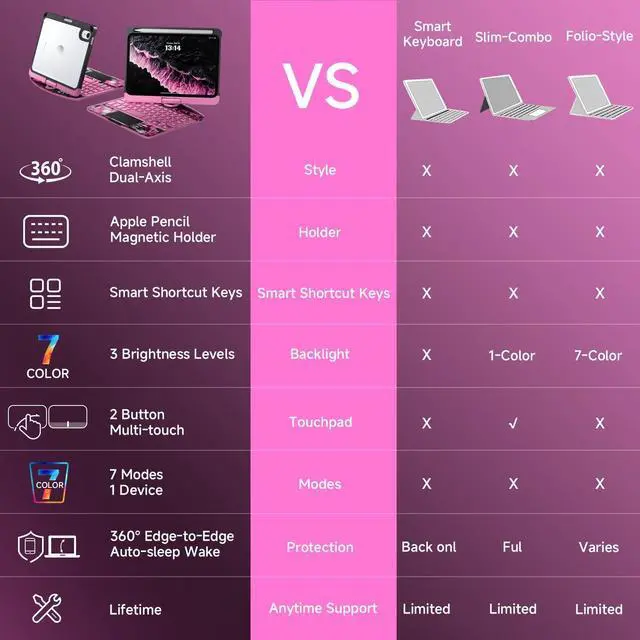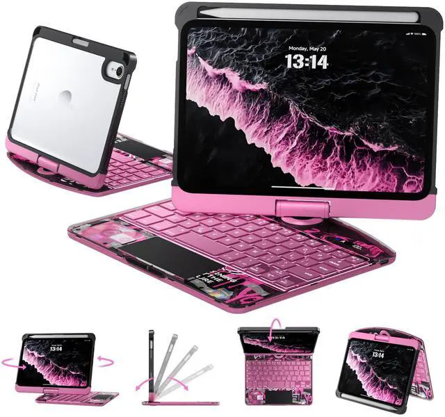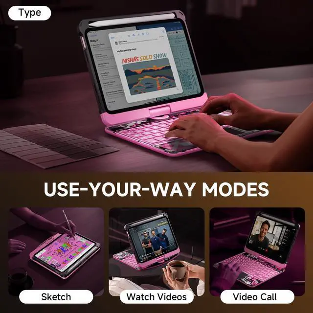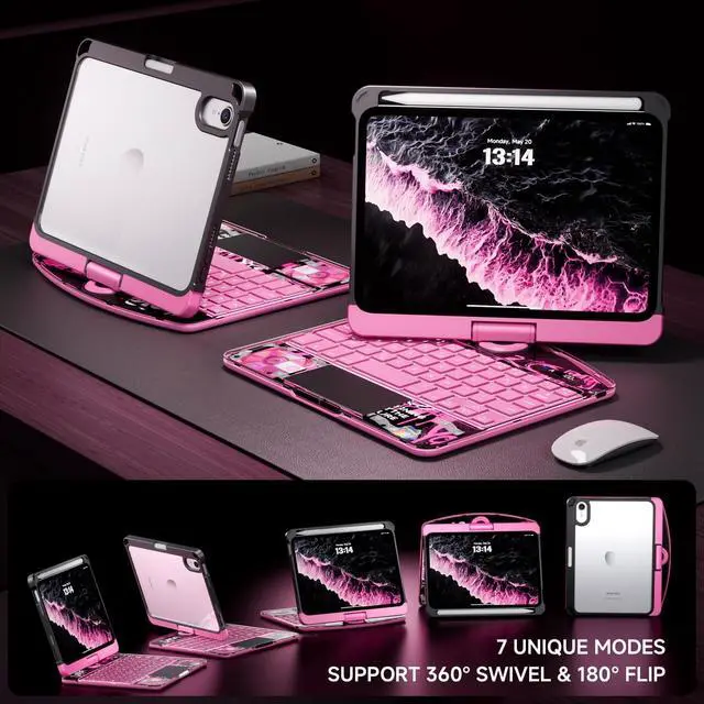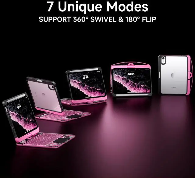 Flip: This case supports 360 rotation and an infinite viewing angle from 0 to 180, ensuring a comfortable perspective for typing, reading, and gaming, providing you with amazing versatility. It can be easily adjusted to any angle that suits you perfectly. You can take it to school, travel, work from home, write, or watch videos. ^^ Illuminated Typing + 7-Color