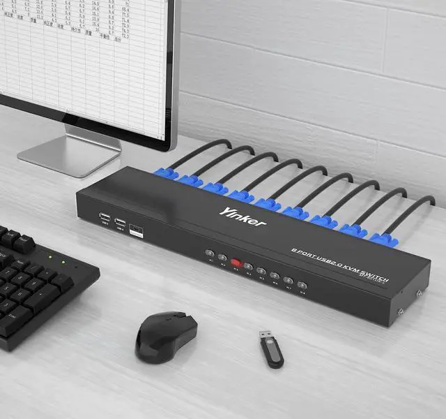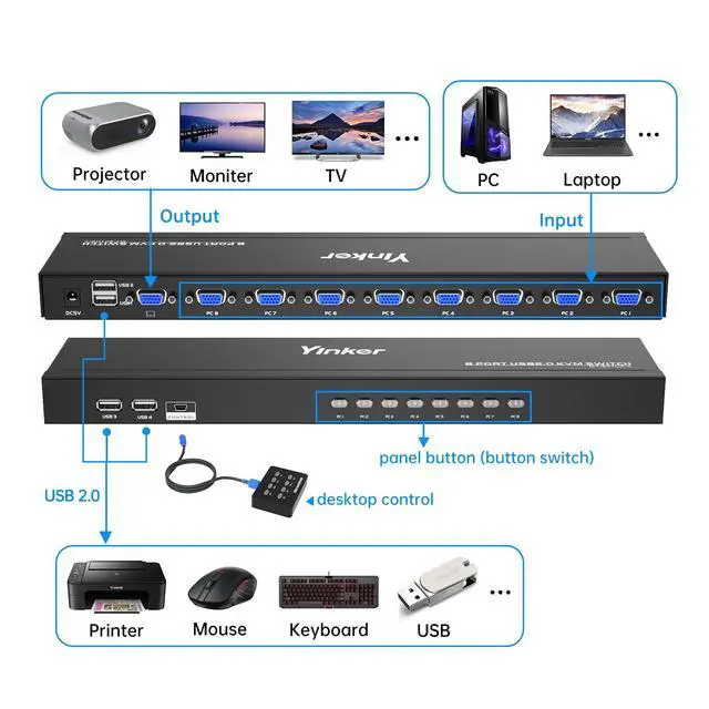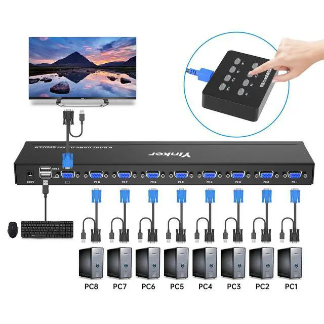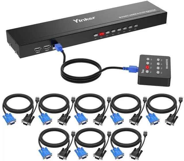 8 port USB VGA KVM Switch Yinker allows managing 8 computers with one set of monitor, keyboard and mouse. Also share one USB speaker or other USB devices. ^^ 8 in 1 out VGA KVM Switch supports Panel Button switch and Wired Desktop Selector switch. The novel Wired Desktop Selector is used for longer distance. ^^ 8 Port Rackmount VGA KVM supports Plug and Play, no software and power adapter required. Gain power electricity and transfer data from the USB&VGA 2in1 KVM cable.