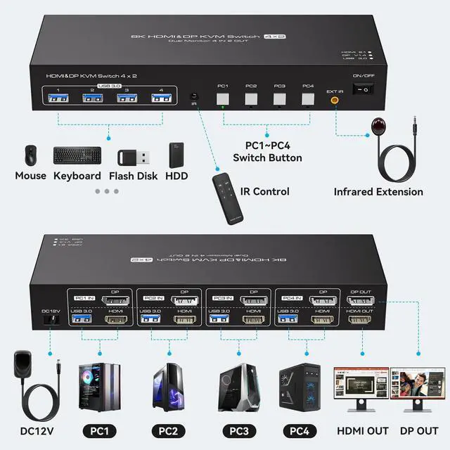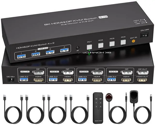 ServiceThis KVM Switch contains: 1*8K HDMI&DP KVM Switch, 1*DC12V power adapter, 4*USB A-A type cable (1m), 1*Remote control, 1*Extend IR, 1*User manual. If you have any problem during the use. Please contact us. We will provide professional technical support for you.