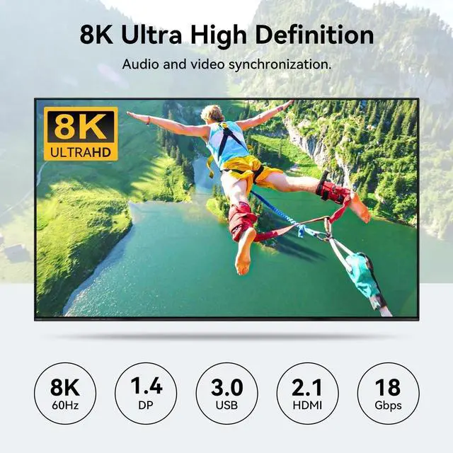monitors: one with DP port, another with HDMI port. ) ^^ 8K ResolutionThis KVM switch supports up to 8K@60Hz/4K@120Hz and is backward compatible with 2K/1080P/720/480/240, which really makes the video transmission HD smooth and without delay.