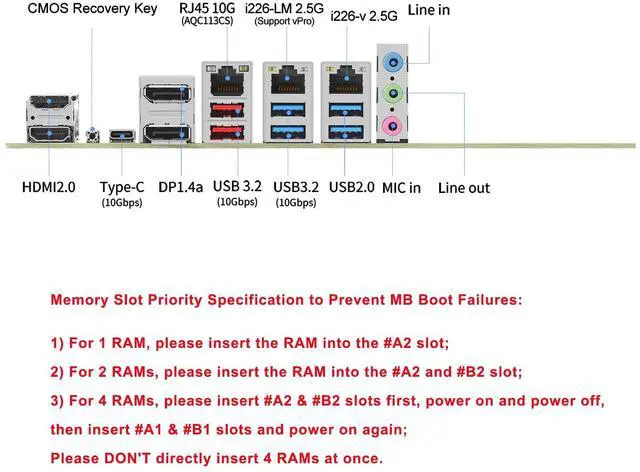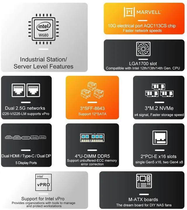 Network Port: This W680 NAS motherboard has 1* 10GB AQC113CS network chip on board (Since some systems are not compatible with this AQC113CS 10GbE NIC chip, please confirm or consult with the seller about whether the system you will use is compatible with this NIC before purchasing), 1* i226-v 2.5G bE port and 1* i226-LM 2.5G bE port. i226-LM port supports vPro function, but it requires the processor is integrated graphics and setting in BIOS. The vPro is essential for remotely repairing a malfunctioning computer that is unable to access the system ^^ 5