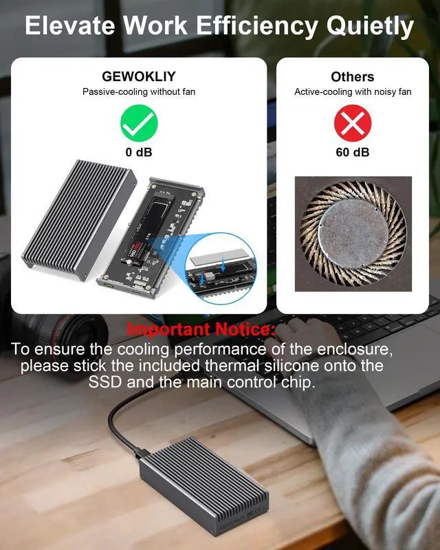 Breakneck Speedy NVMe Enclosure: Gewokliy Thunderbolt 4 M. 2 SSD Enclosure fix the transmission speed of SSD up to 40 Gbps, which is adopted newest chip and built-in thunderbolt 4 cable tp ensure the maximum performace. Generally, the read speed reach at 2800MB/s while write speed at 3200MB/s. Make it possible to transfer 10G files within seconds. Elevate your work efficiency. The SSD adapter also compatible with Thunderbolt3/4, USB 3.2 / 3.1 / 3.0 interfaces (Note: ONLY Thunderbolt4/3 interface to reach 40Gbps). ^^ Keep the